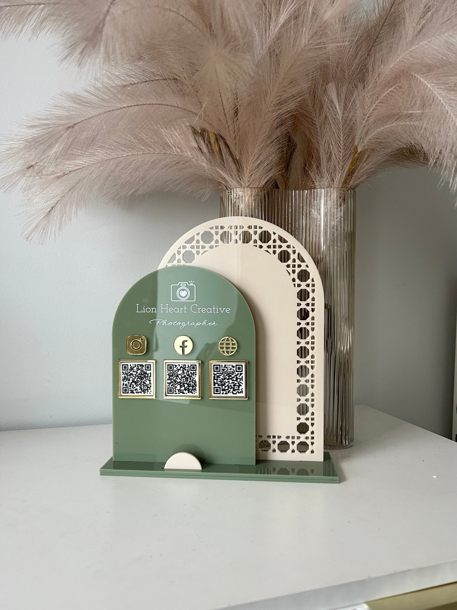 Fits 1-3 QR codes on the left piece. Please let me know after ordering your 3 urls for the codes. We will create the codes for you given we have the correct URLS. Unless it’s a payment QR code, in that case we need a screenshot of the actual code.