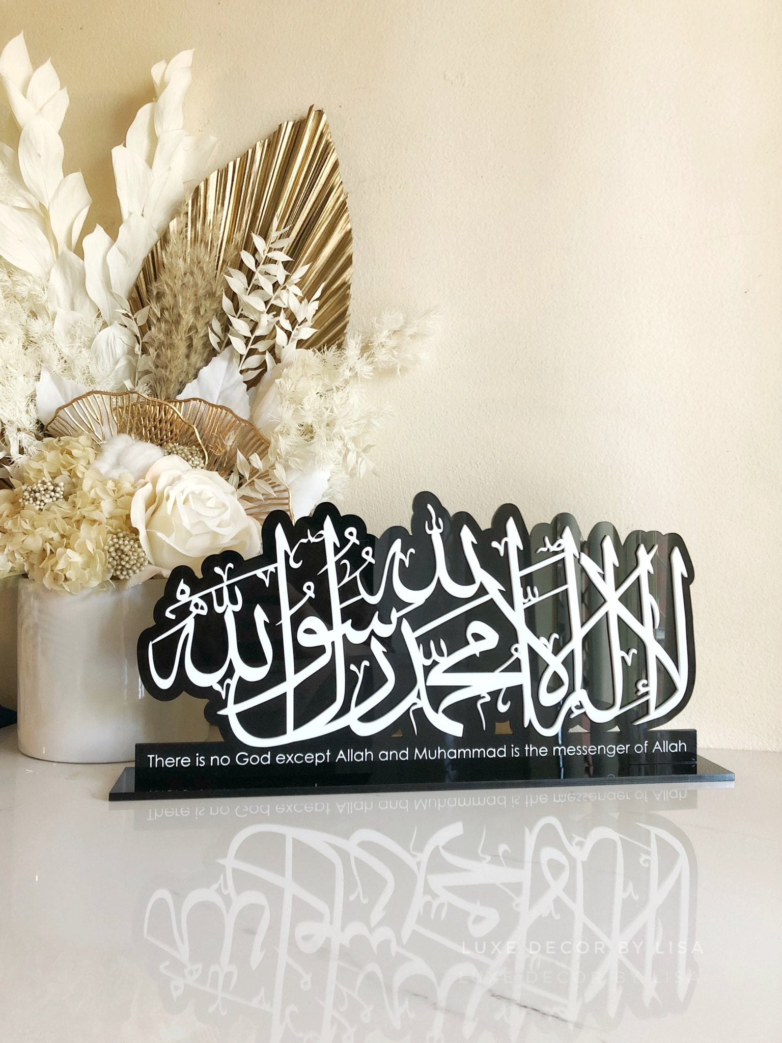 This beautiful freestanding Shahada is 3D which means consists of 2 layers and a base. All in colours of your choice. The Shahada meaning is engraved underneath.