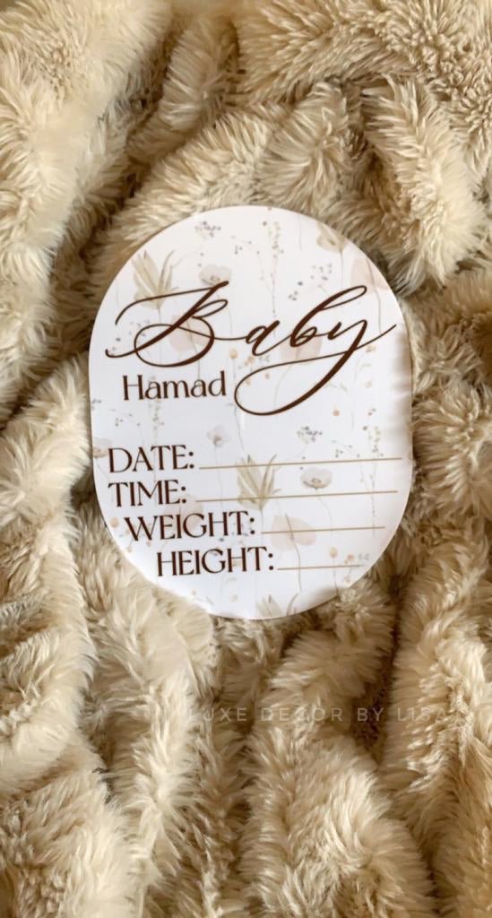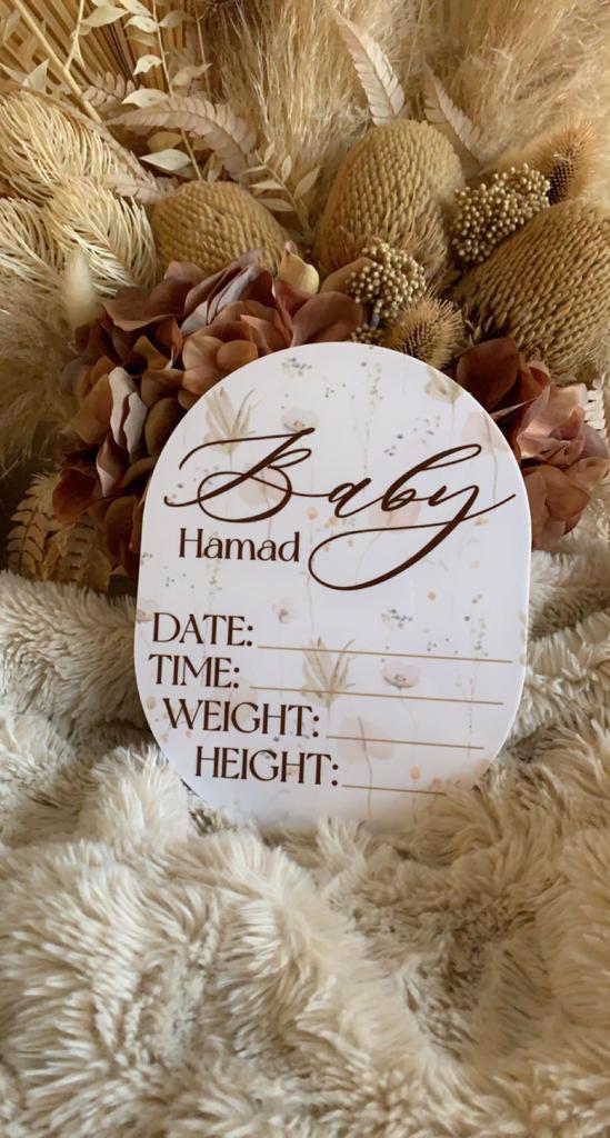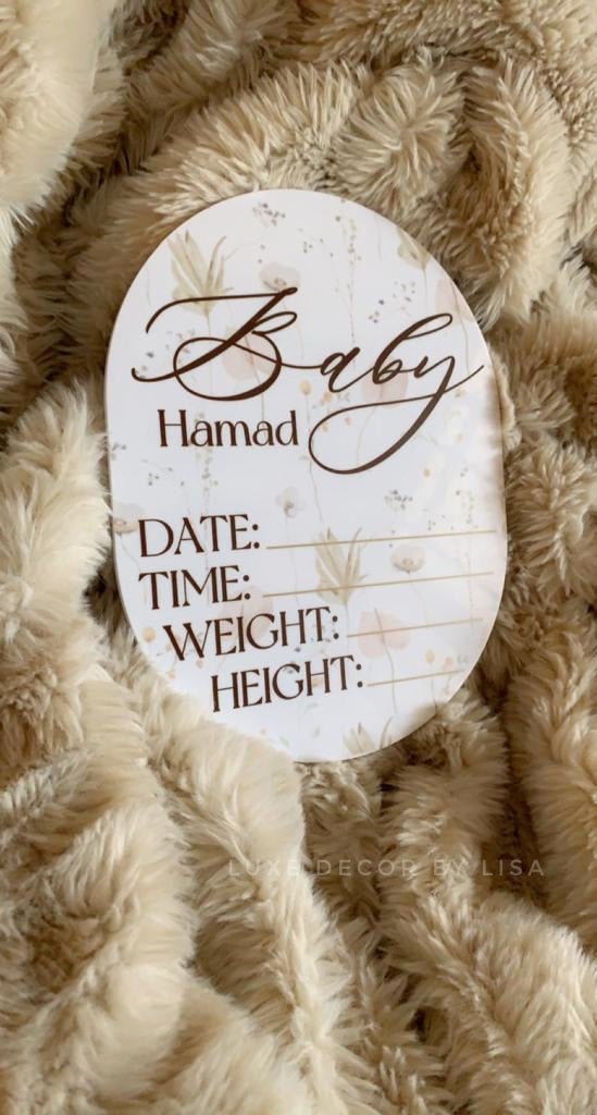 The first name will be written in the cursive font pictured and surname (optional) in a block font underneath. Please mention the name needed in the design details section. We can print out the details of the date, time, weight and height or you can fill that in using a permanent marker.