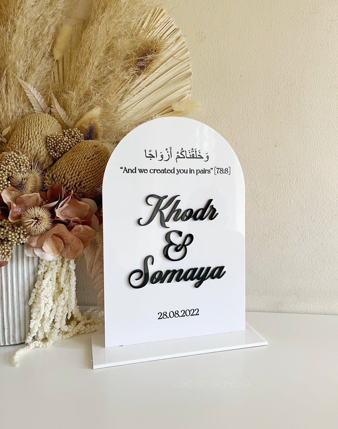Arch will be white acrylic with printed black or brown smaller text. Or choose mirror acrylic like the second image.