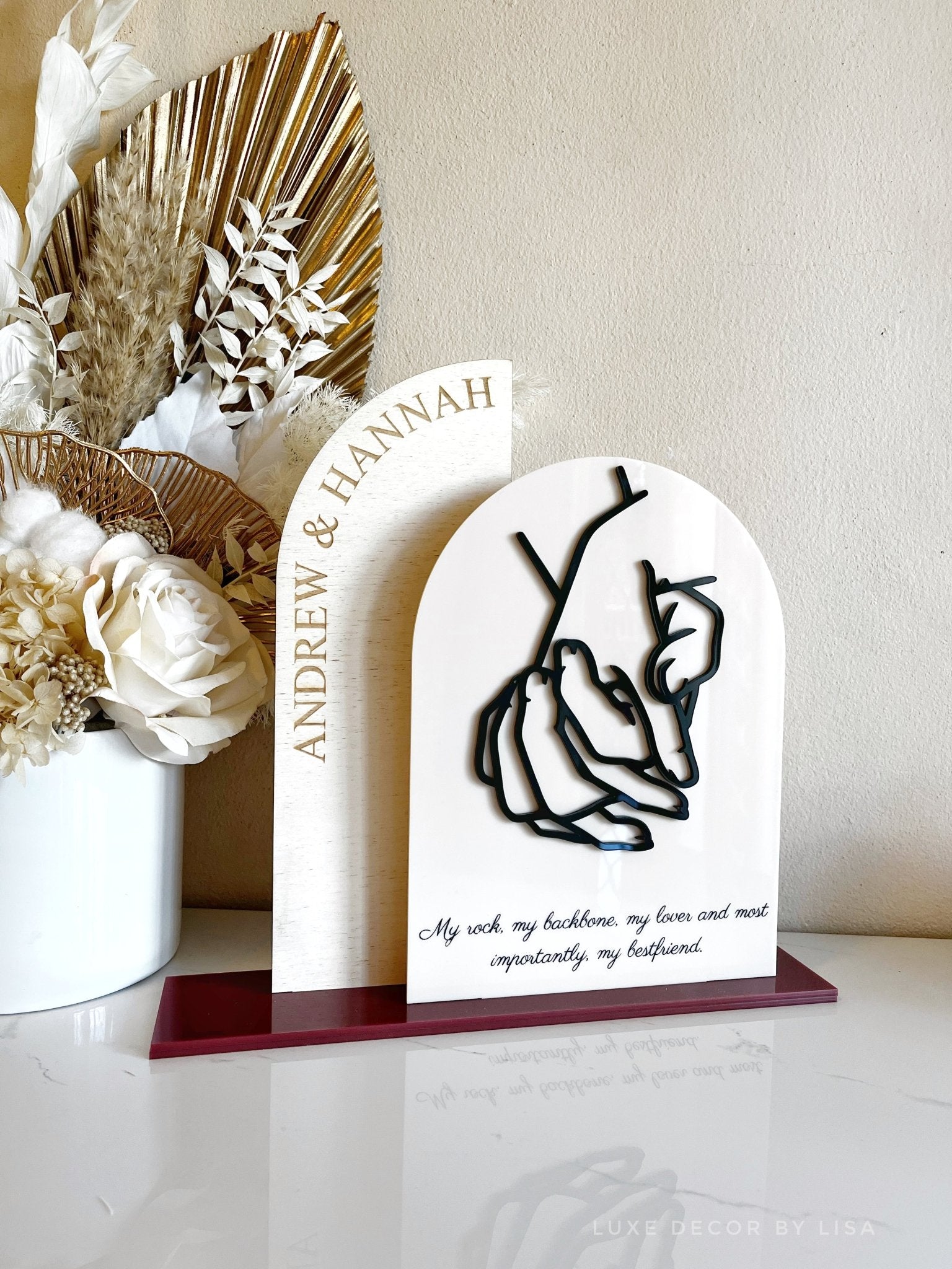 The plywood piece on the left can be customised with your names and the arch with a quote/message, can be customised to a similar amount of wording. Or leave the same wording as pictured.
