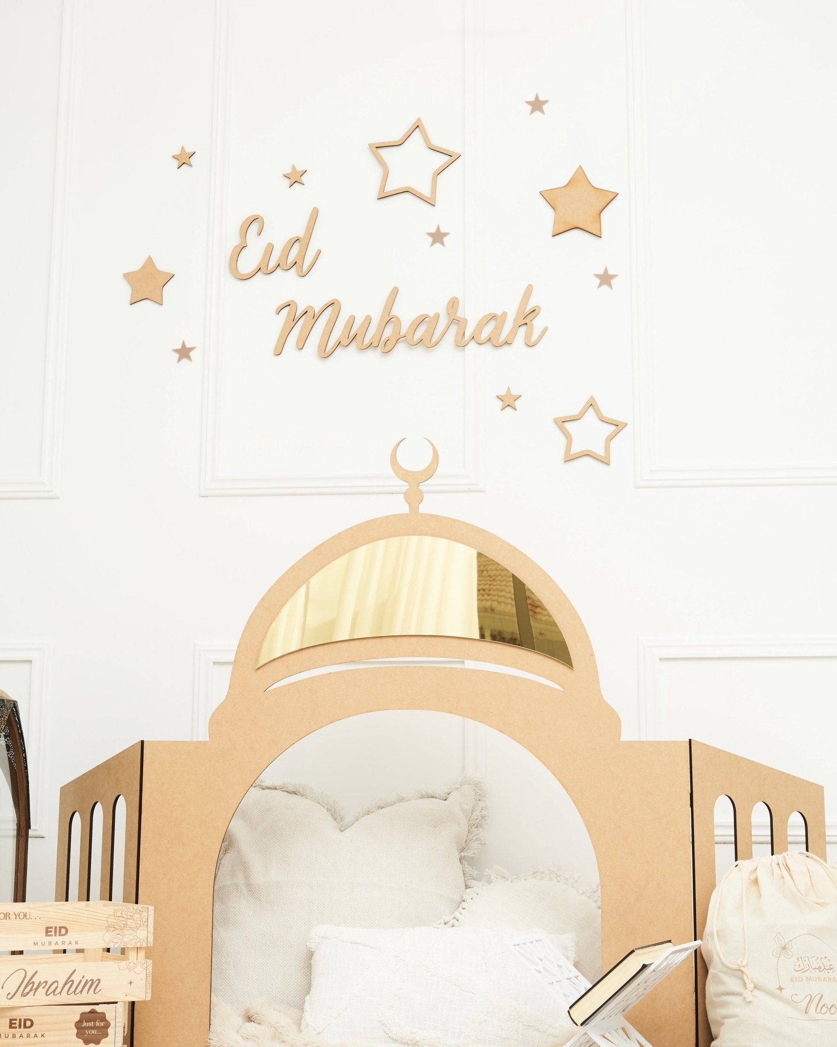 Front piece is 1.1m tall x 86cm wide. This design can be left in raw wood as pictured or painted by you and your children InshaaAllah. Each side panel is 38cm wide x 57cm tall.