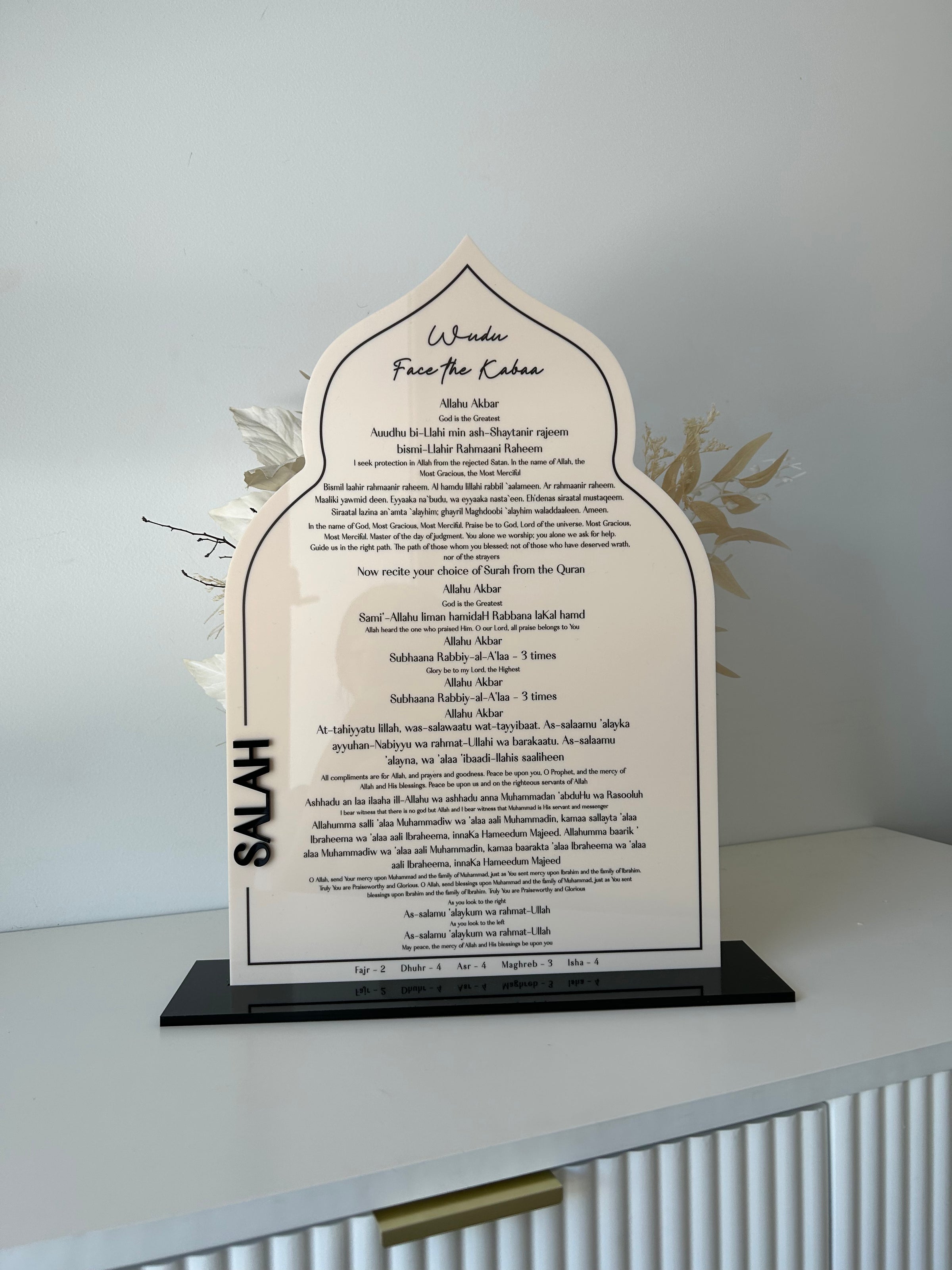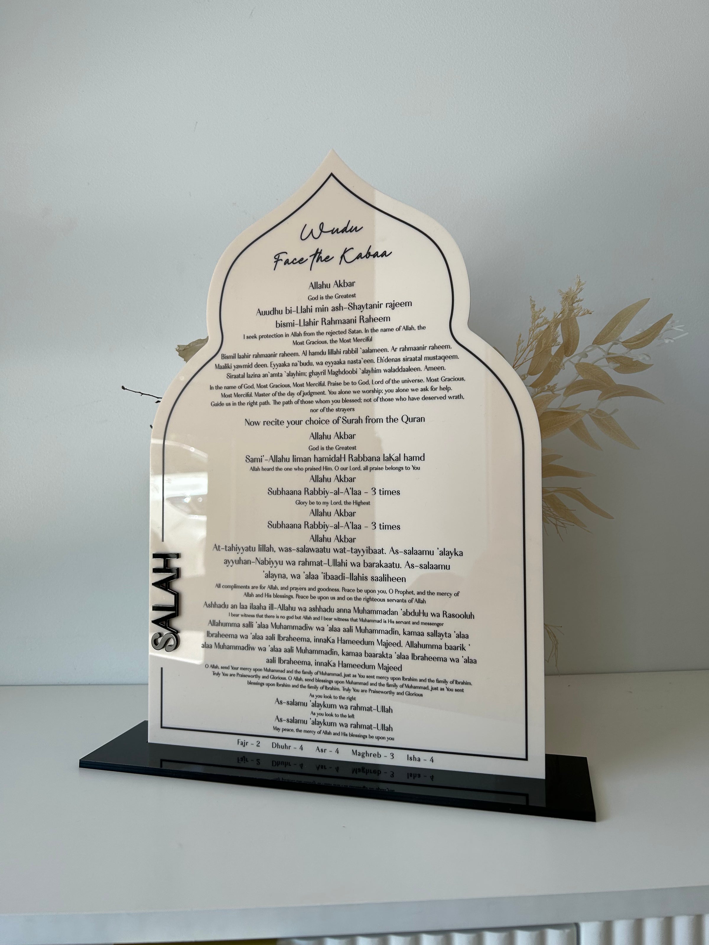 As pictured, the transliteration and meaning of the Islamic Prayer. With Rakat at the bottom.