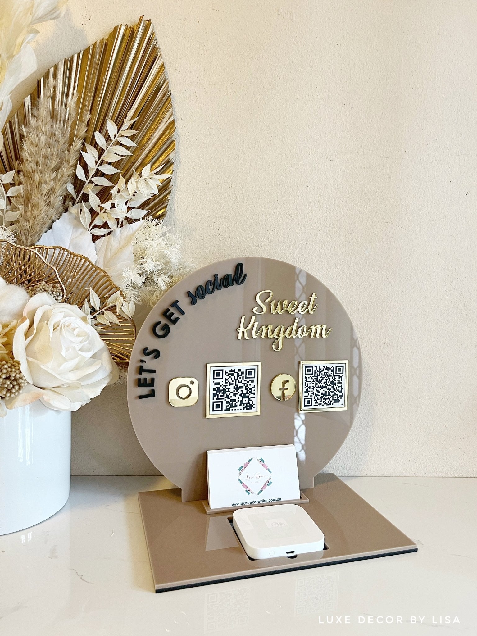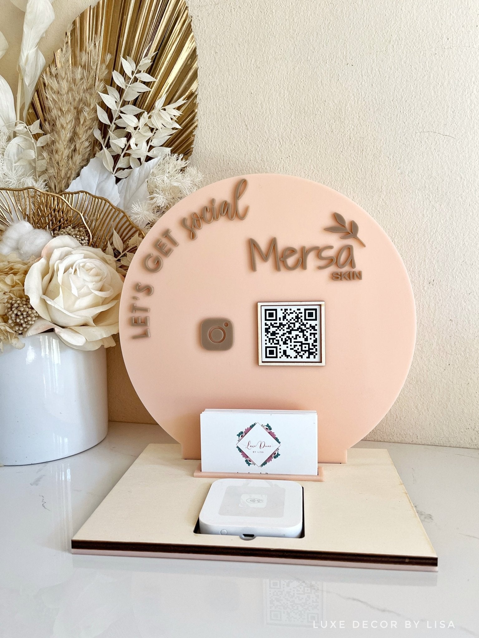 1 or 2 QR’s in the centre, place for your square machine and your business cards