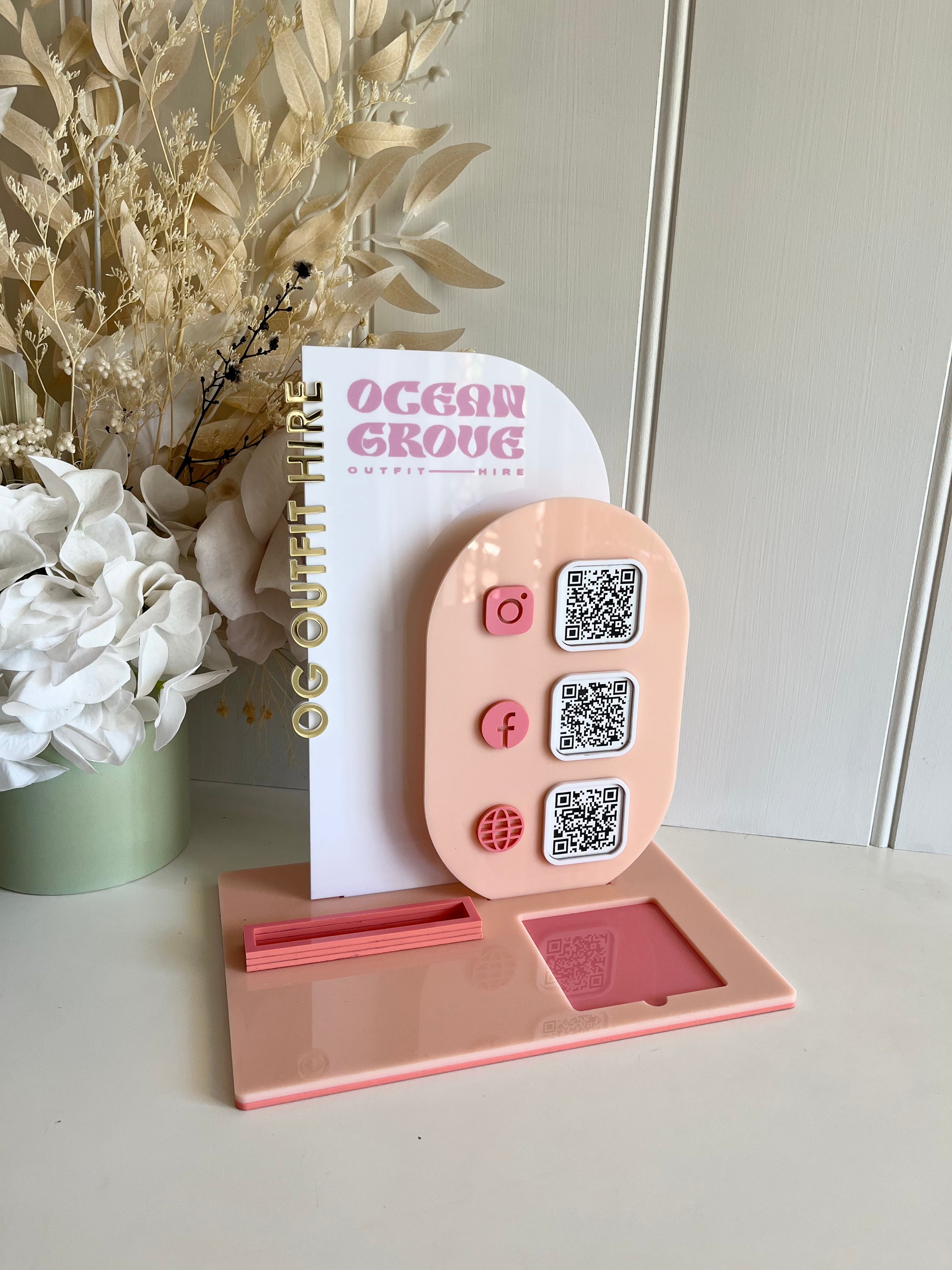 Back piece - white with rose gold SCAN TO FOLLOW US or business name (no longer than 15 letters)