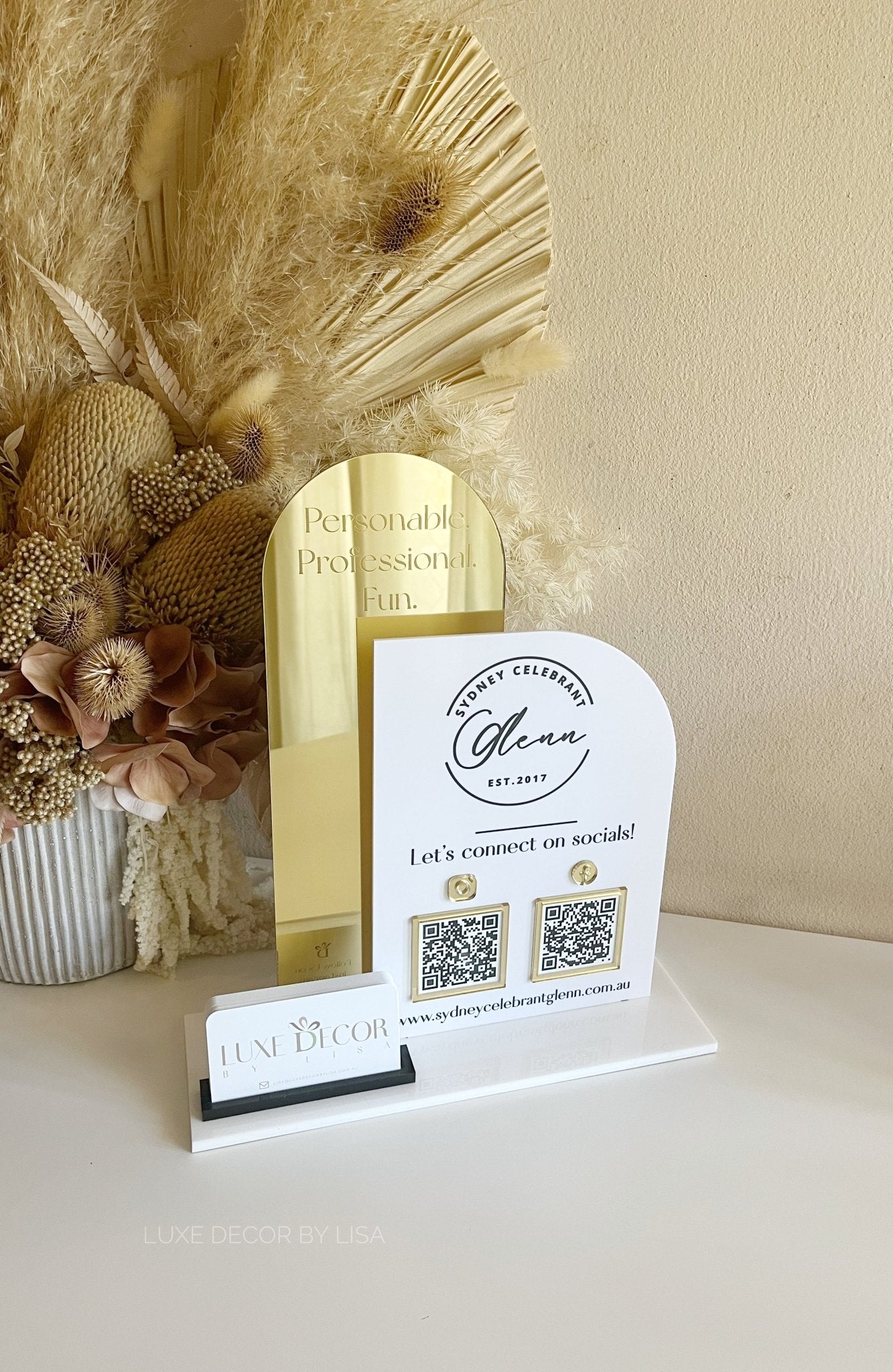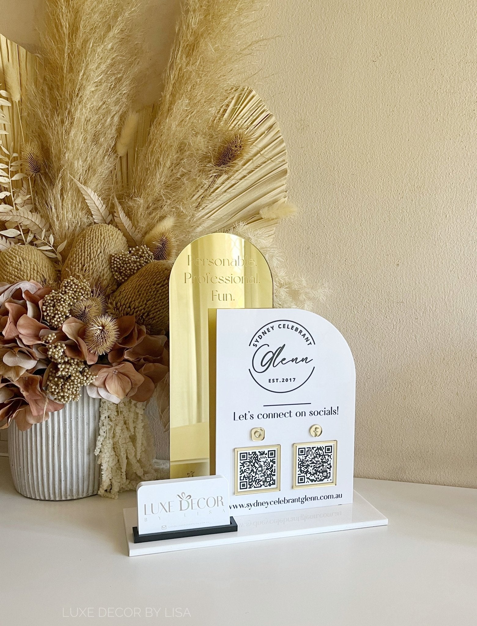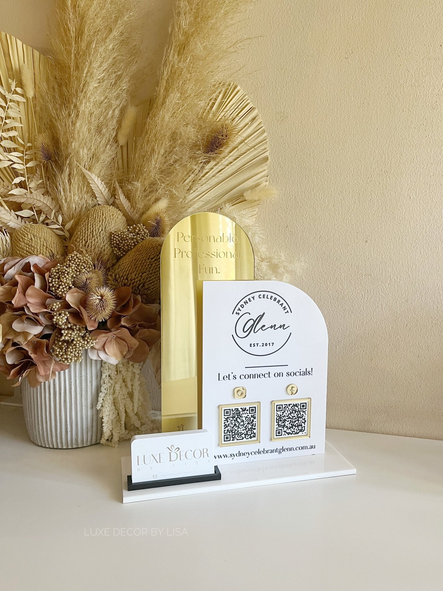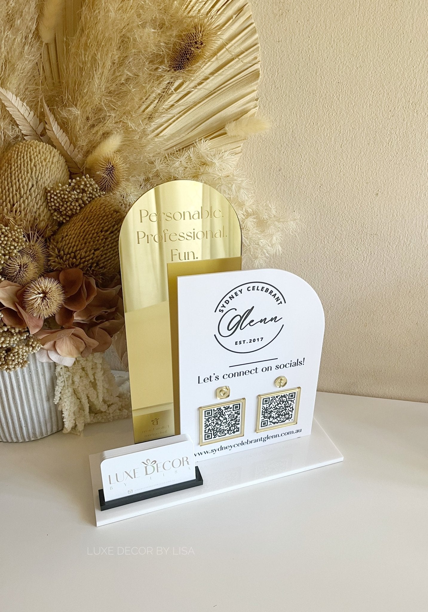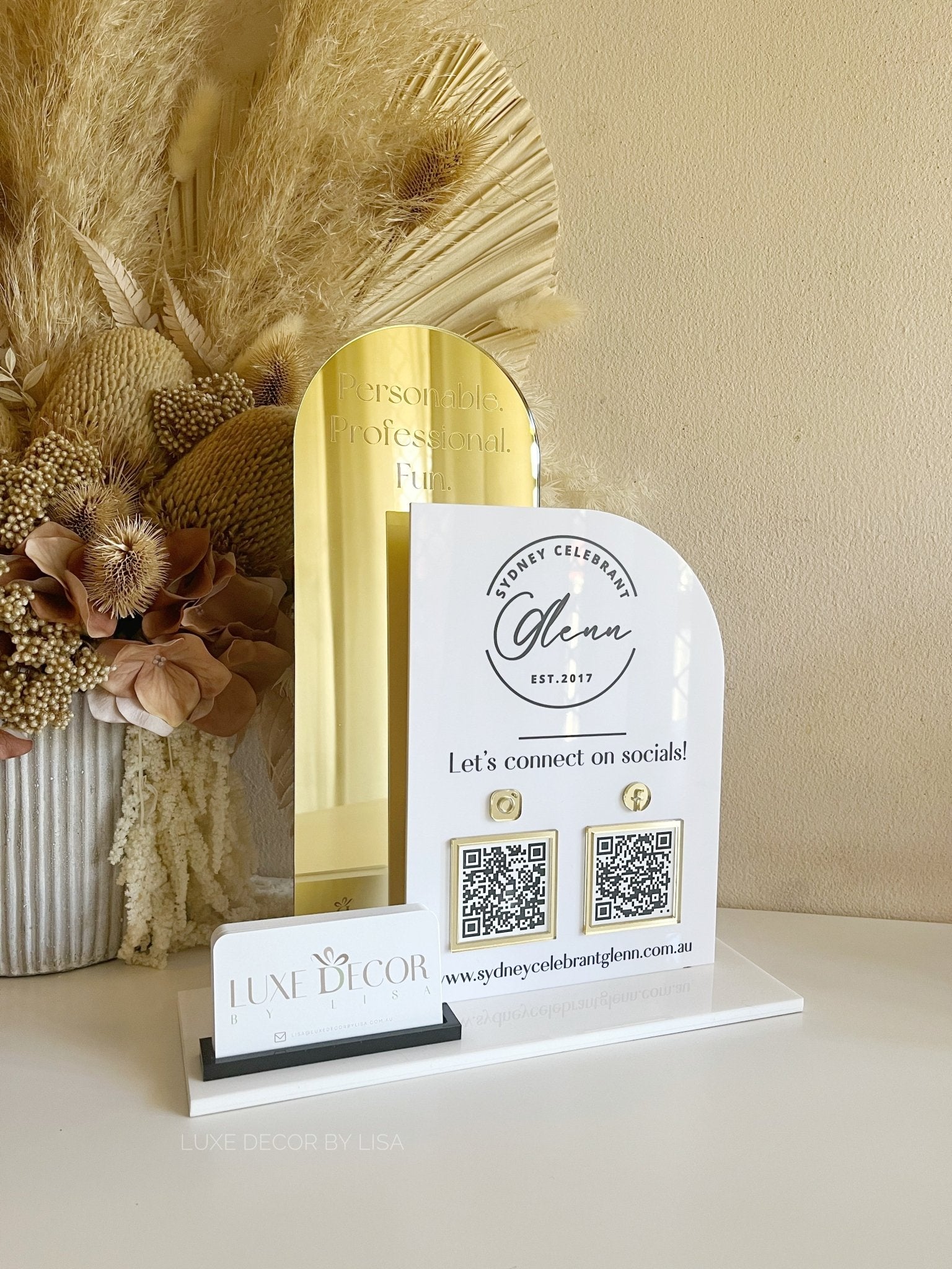 Your logo printed, 2 QR codes, your website and a place for your business cards. Optional extra to include a short phrase on the top of the gold mirror acrylic arched shape.