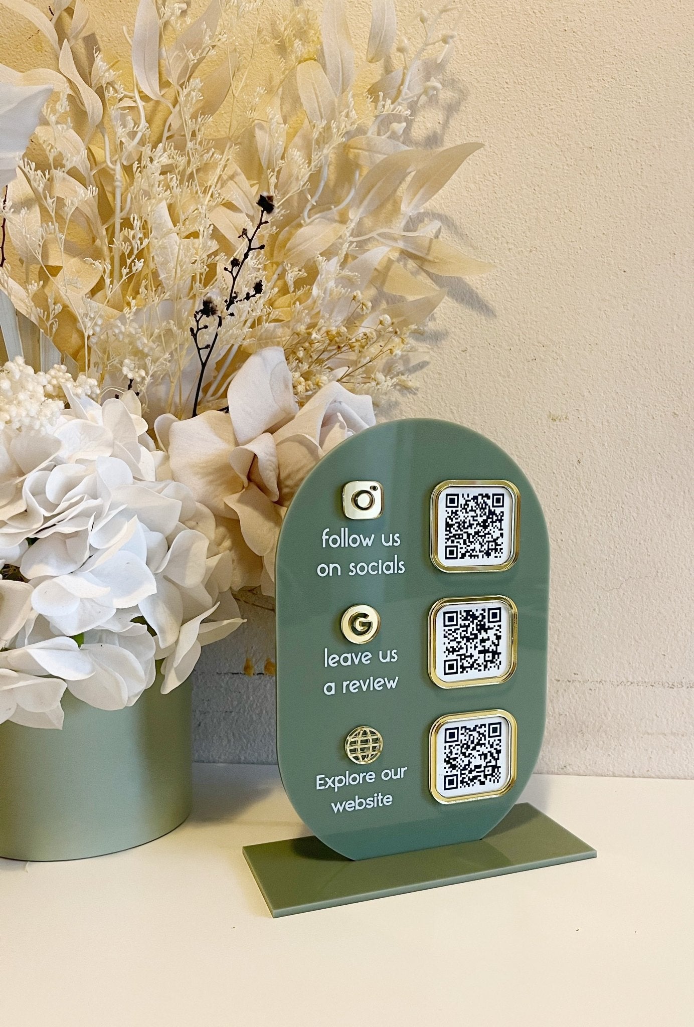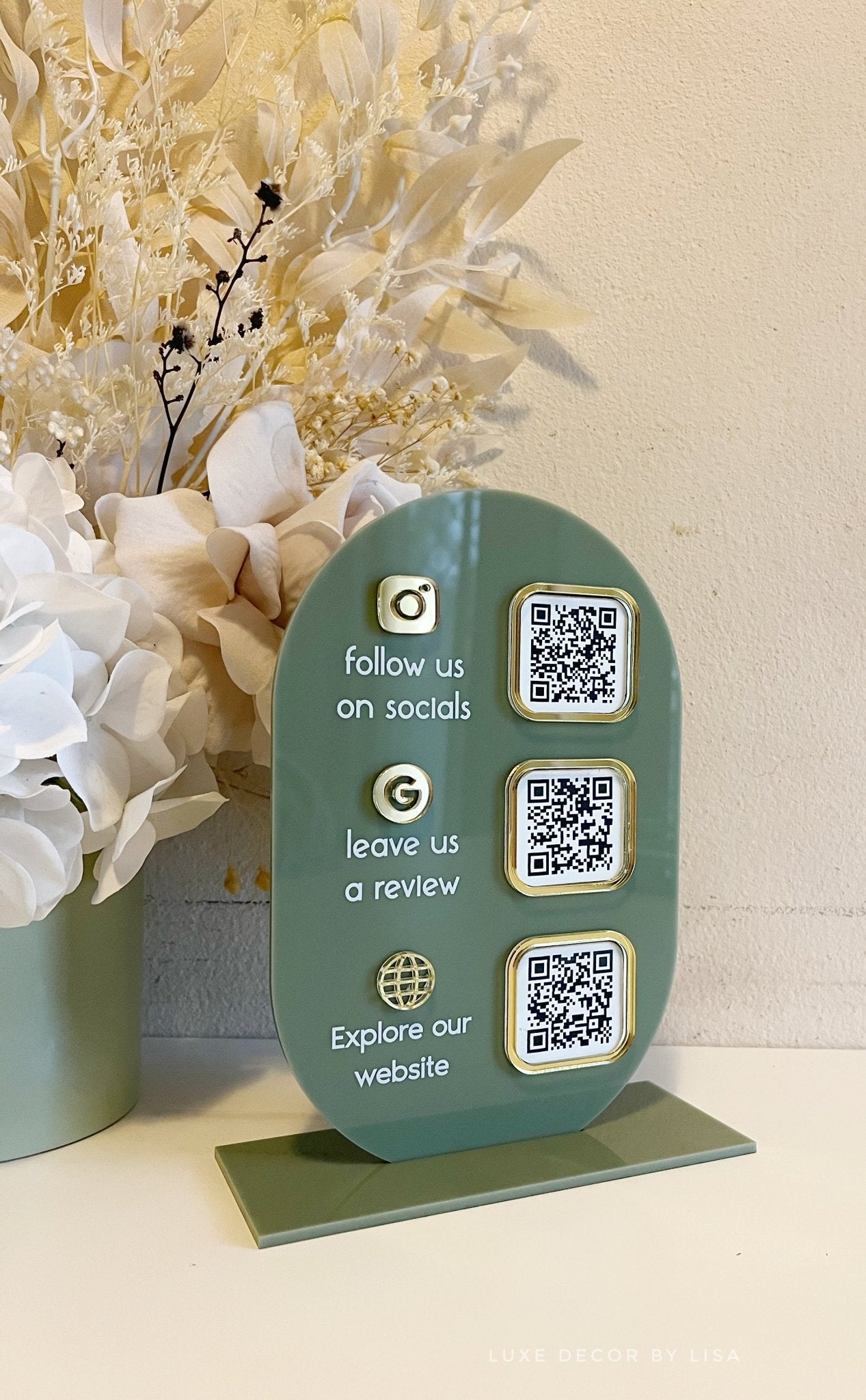 3 QR's fit well on this sign. Please email admin@luxedecorbylisa.com.au with your colour requirements and 3 URL's.