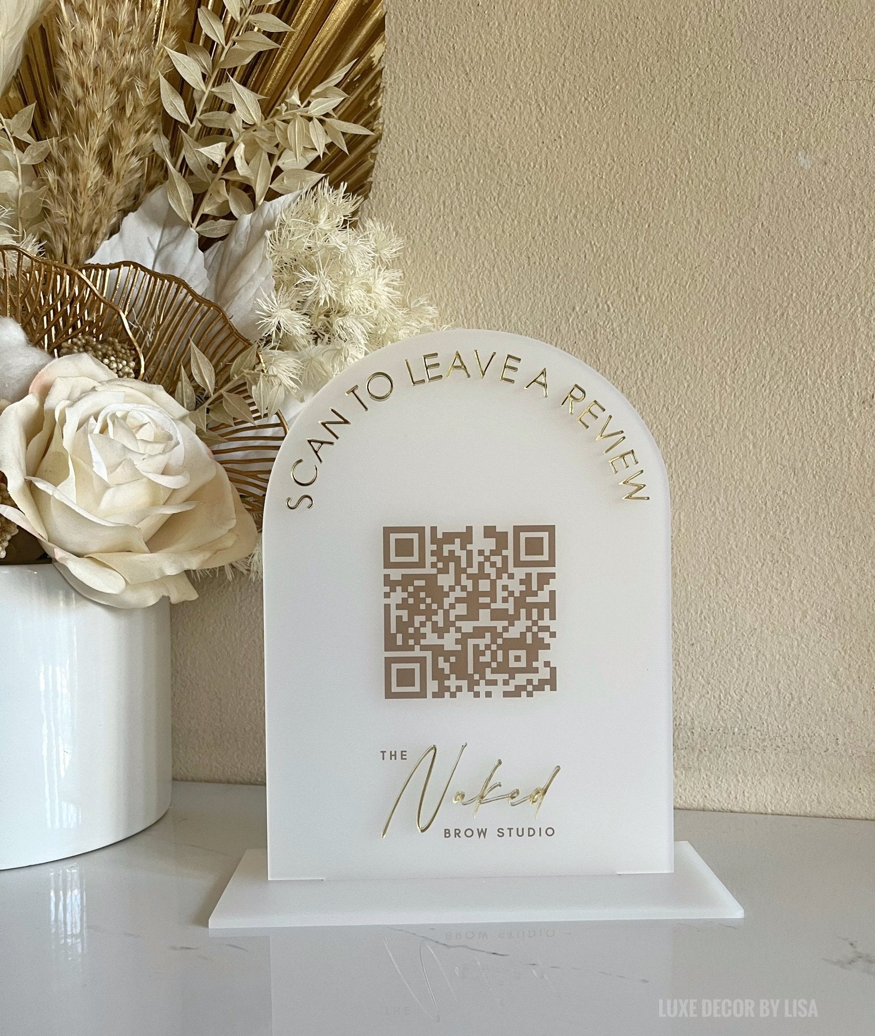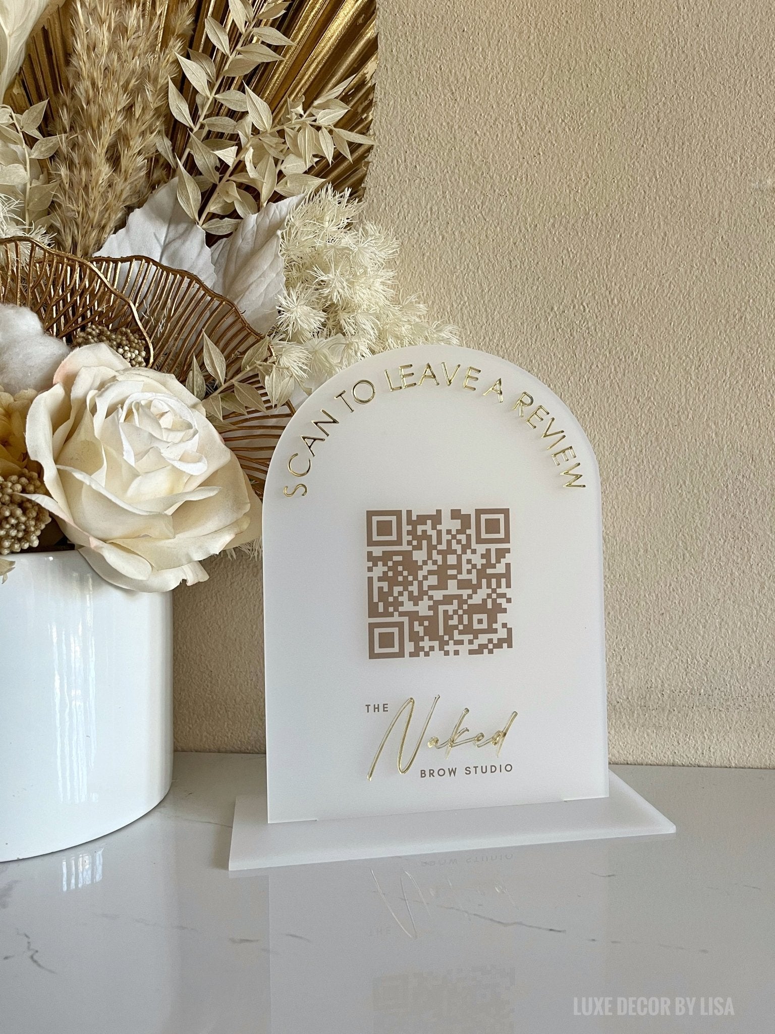 Please mention when checking out the colour acrylic you would like for the arch, 3D writing around the border and the border around the QR code (any colour acrylic from our range), and the printed QR/logo at the bottom colour. (the printed QR/Logo can be any CMYK colour if it’s going on white/black acrylic, or if your background arch is a colour acrylic, we can print your logo and QR in black or white)