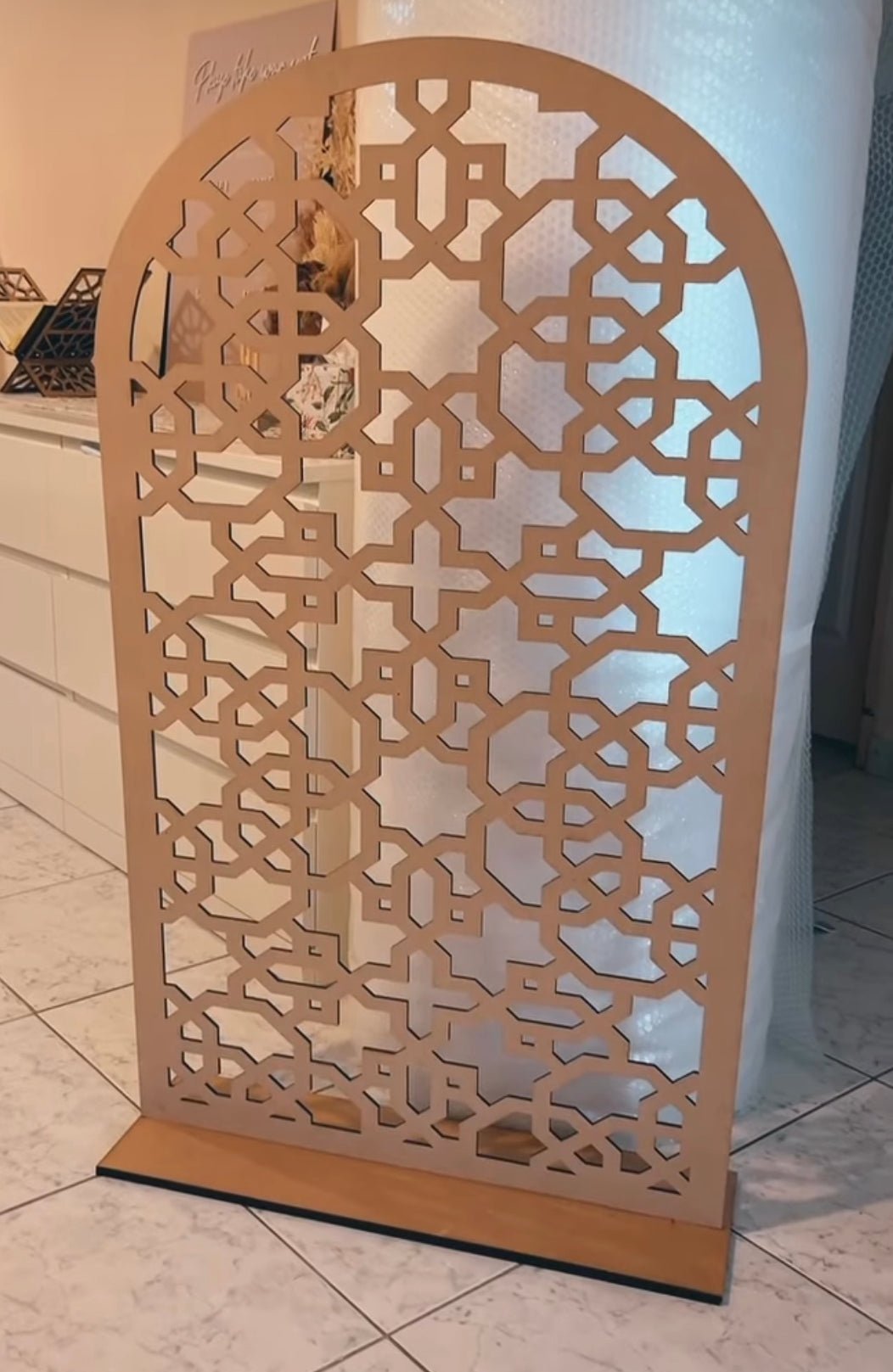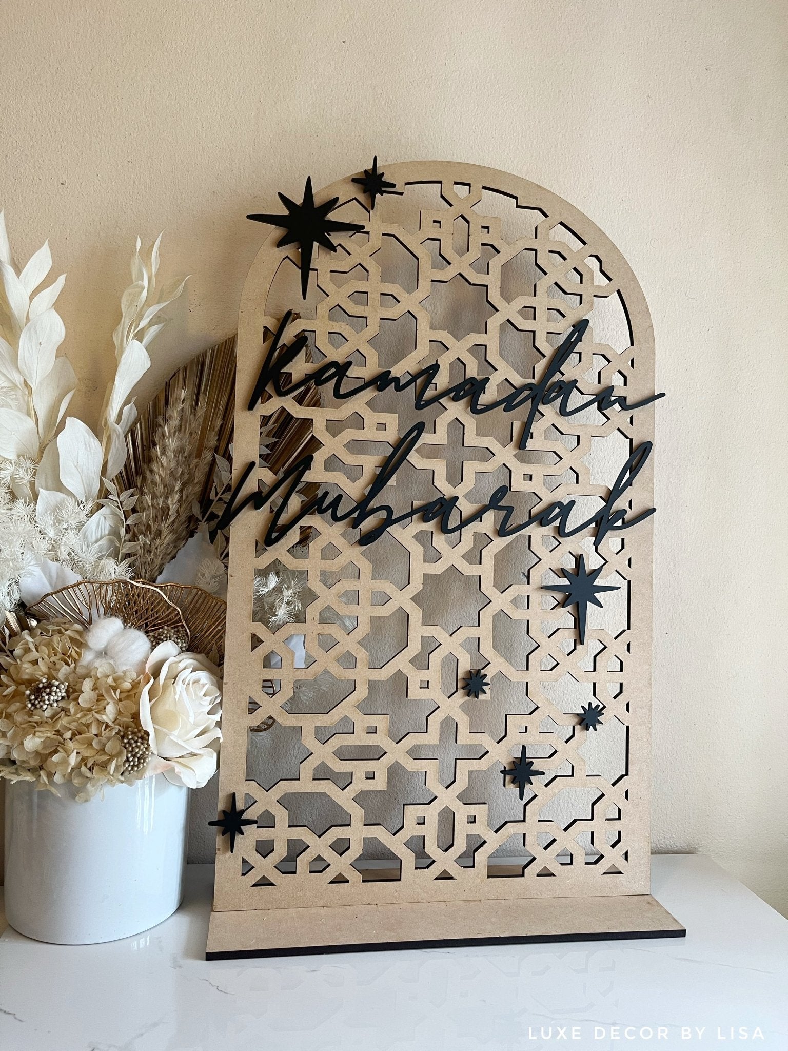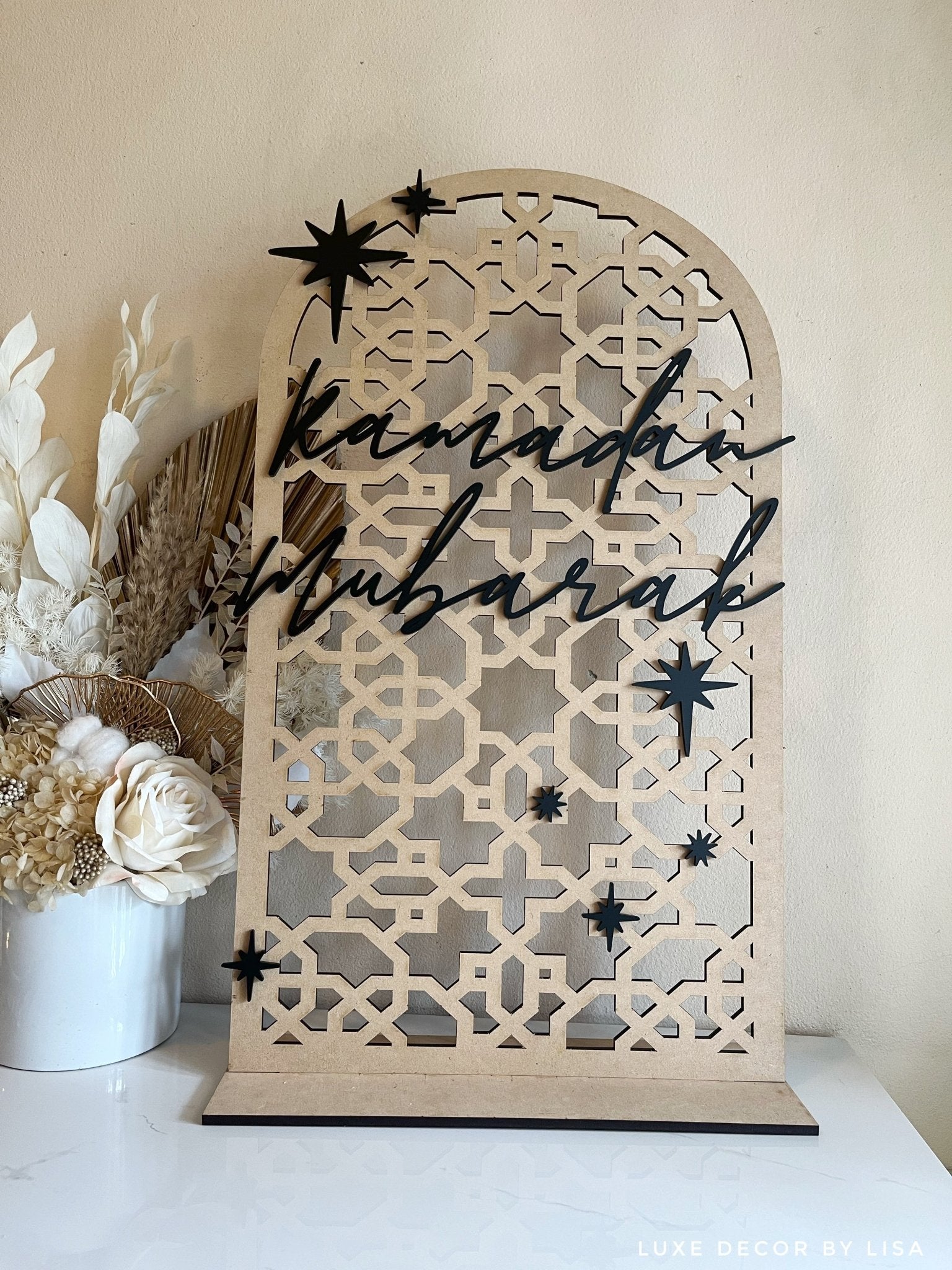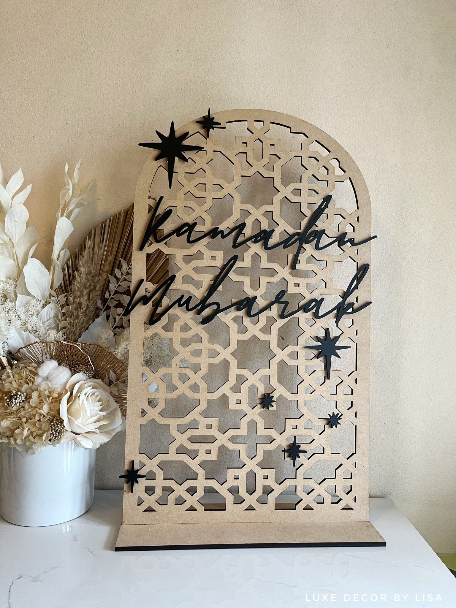 Choose between raw wood or coloured options for your arch and base. You also have the choice to add on Ramadan Mubarak acrylic words and 7 stars to be stuck onto the front of the design using double sided strips or blue tack.