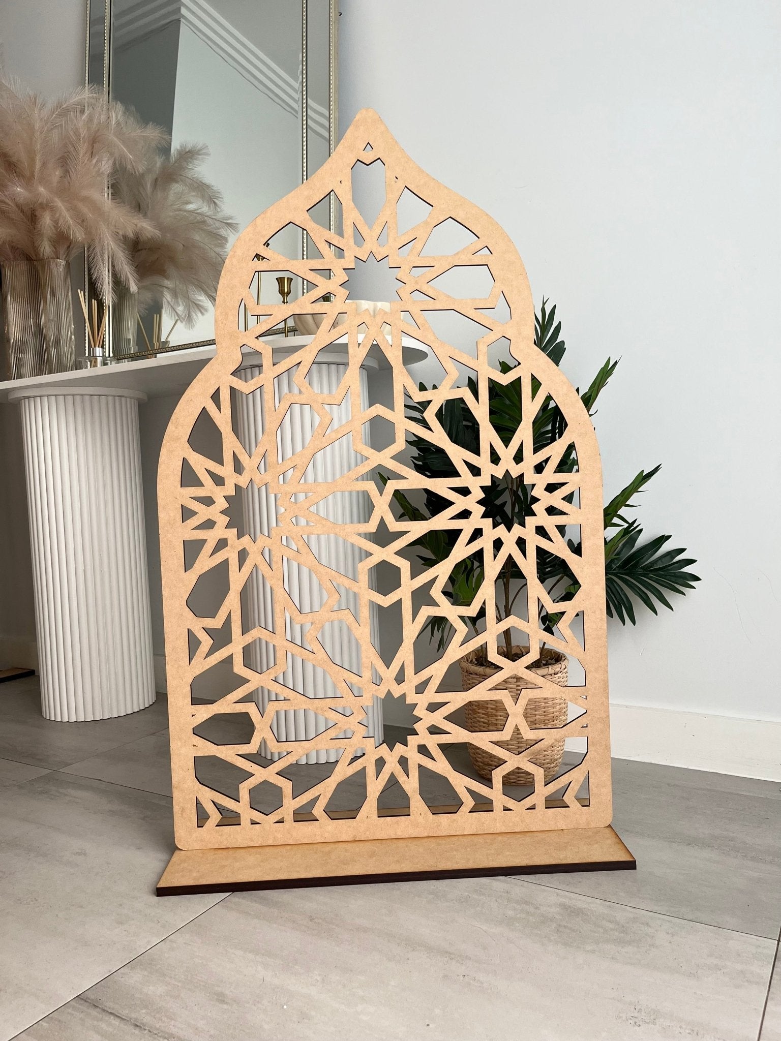 Choose between raw wood or coloured options for your arch and base. You also have the choice to add on Ramadan Mubarak acrylic words which will come attached to your design.