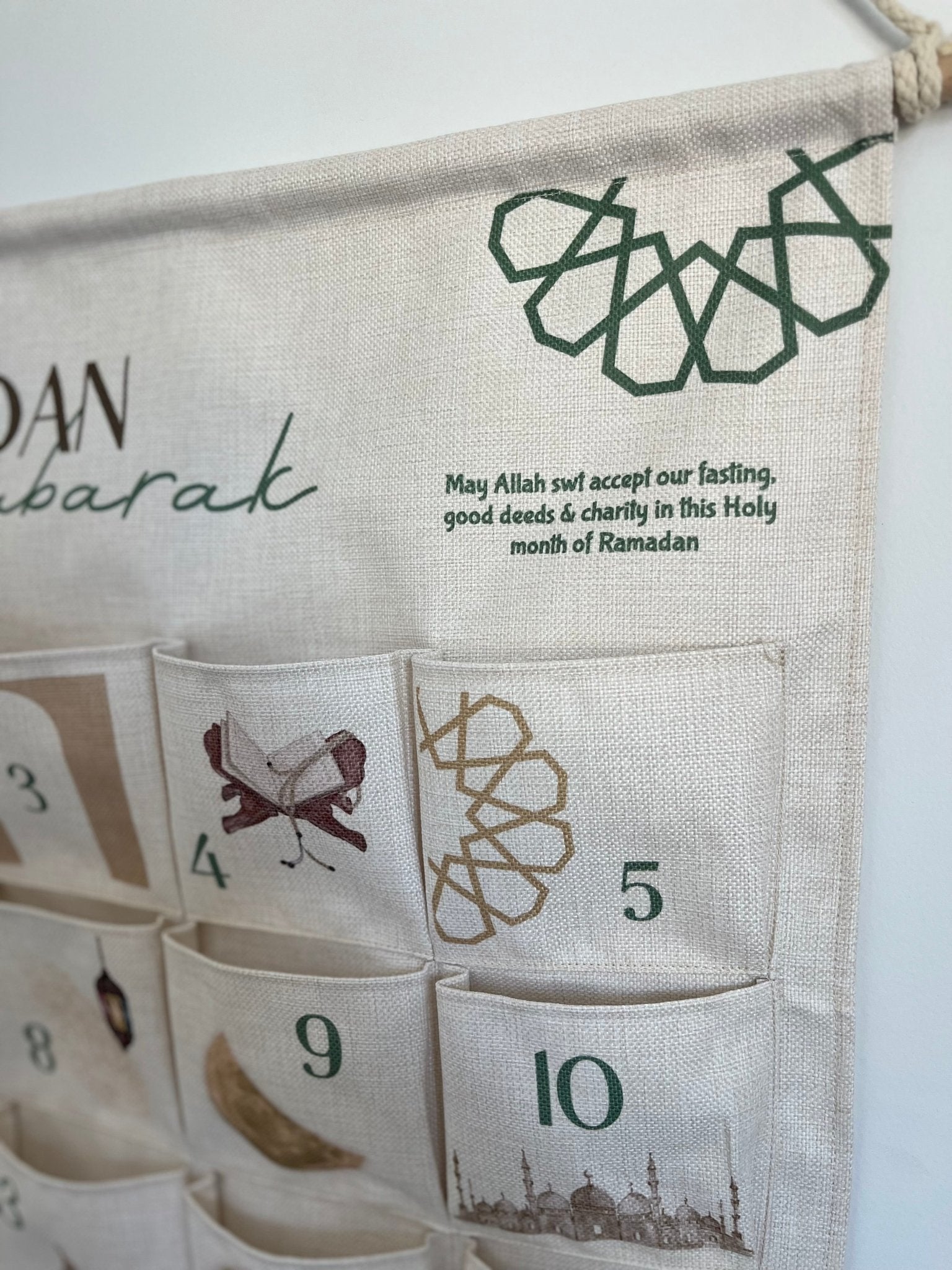 - 30 pockets to fill with notes, treats or sweets, small gifts or Islamic reminders